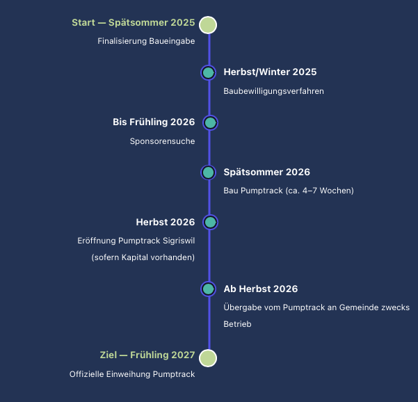 - Sollte mittels Sponsorings nicht genügend Geld zusammenkommen, kann es zu Anpassungen vom Layout bzw. Reduktion von Pumptrack-Features kommen.